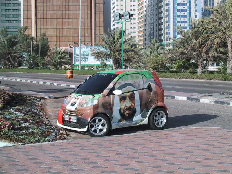 Sheik Zayed is the leader of the United Arab Emirates, and by all accounts a pretty good one. There are pictures of him all over Abu Dhabi, including one on that funky car above. There is also this large mural wall near my hotel that I thought was cool, so I took some photos of that. Here are two photos of the mural.